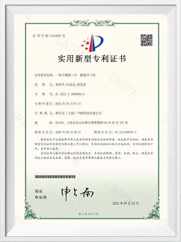Et rustfrit stål tre-i-en-pladeændrende koldtørrer-utility-model Patentcertifikat