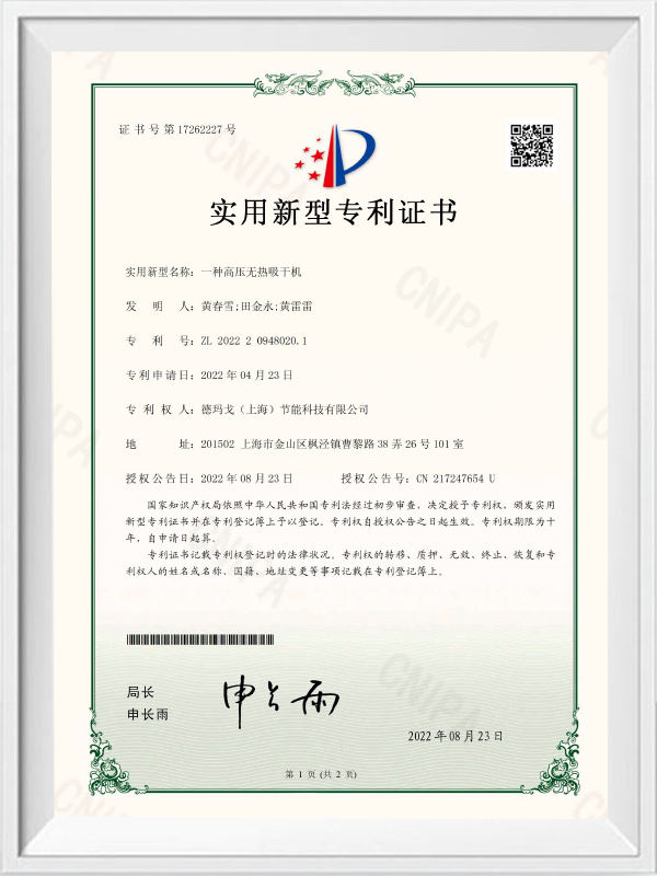 Et højtryks varmefrit sugetørrer-utility model patentcertifikat