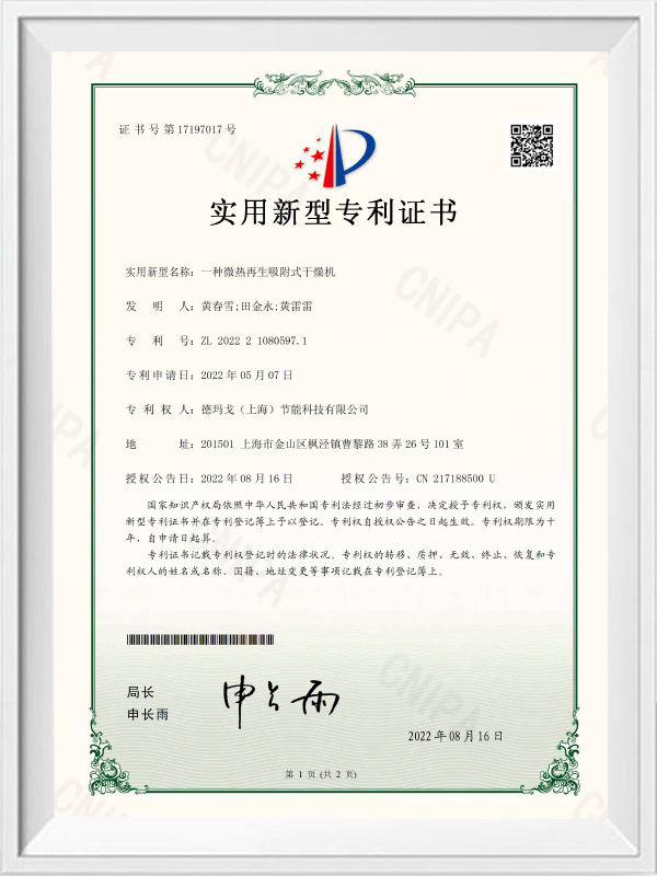 En mikro-termisk regenerativ adsorption tørretumbler-utility model patentcertifikat