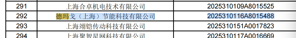 Blandt de udvalgte virksomheder, Demargo (Shanghai) Energy Saving Technology Co., Ltd. er blevet opført med registreringskoden 2025310116A8015488 .