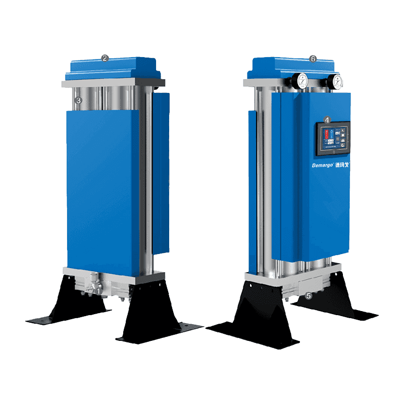 Mikroopvarmningstypen er 60 til 180 minutter; Mikroopvarmningstypen skifter en gang hver 30. til 90 minut. Arbejdscyklussen består af en tørringsproces med en opadgående luftstrøm og en regenereringsproces med en nedadgående luftstrøm. Under regenerering trækkes en del (ca. 4 til 8%) af den tørrede trykluft (mikroopvarmningstypen en varmelegeme til opvarmning) ud gennem åbningspladen throttling og trykreduktion og kommer ind i tårnet for at desorbere og sprænge fugtigheden adsorberet i udtørringen. Når regenereringen skiftes til tørring, adsorberes fugtigheden i den komprimerede luft igen på tørremidlet, og det cykliske arbejde opnår formålet med tørring.